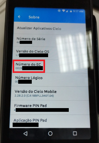 Para poder localizar o EC da maquininha, acesse as configurações da maquininha e acesse os dados Sobre a maquininha, constará o Número do EC.