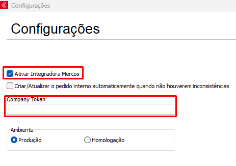 Ao acessar as configurações, marque a opção Ativar Integradora Mercos, também será necessário preencher o Company Token.