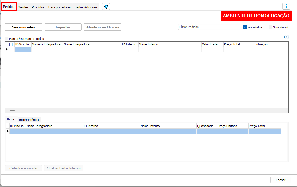 Ao iniciar será apresentado tudo em branco, porém caso você já tenha algum pedido na Mercos no qual queira importar, será necessário pressionar a opção Importar. Ao clicar na opção importar, os pedidos no site da mercos serão importartados para o sistema, podendo então ser visivel através da aba Sincronizados.