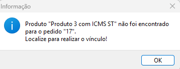 Caso durante a importação não localizar algum Usuario/Produto/Cliente será apresentado uma mensagem e um campo para vinculação ou cadastro do mesmo.