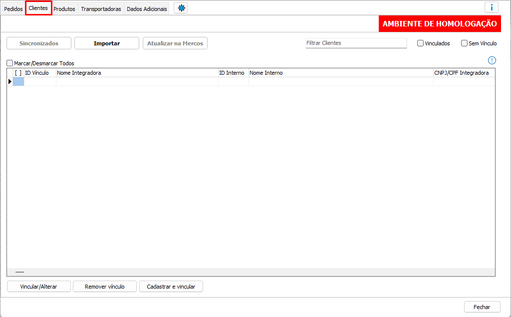A segunda aba será a de clientes, para poder vincular os clientes cadastrados no sistema com o cadastro da Mercos.