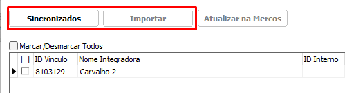 Ao acessar a aba, será apresentado tudo em branco, porém caso você já tenha algum cliente cadastrado no Mercos no qual queira cadastrar ou vincular no sistema, será necessário pressionar a opção Importar. Ao clicar na opção importar, os clientes no site do mercos serão importartados para o sistema, podendo então ser visivel através da aba Sincronizados.