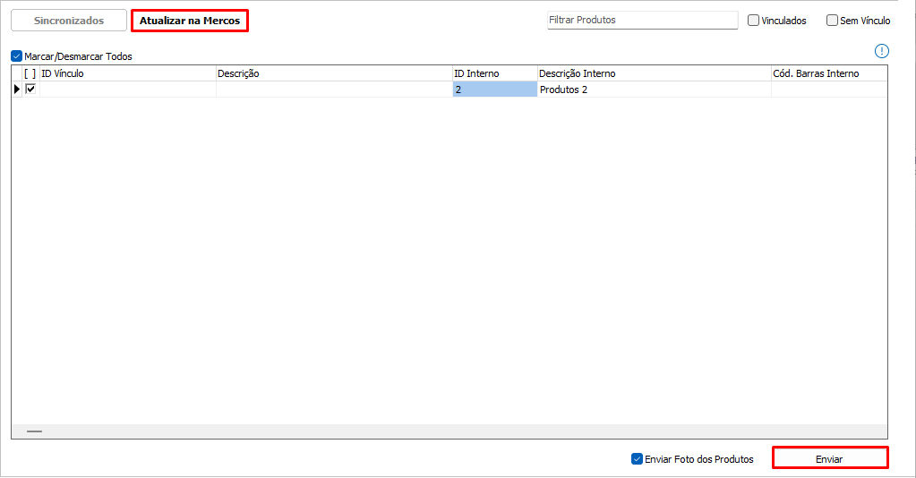 Para enviar um produto cadastrado no sistema para o site do Mercos, será possível acessando o menu Atualizar no Mercos e após isso selecionar os produtos não vinculádos e Enviar.