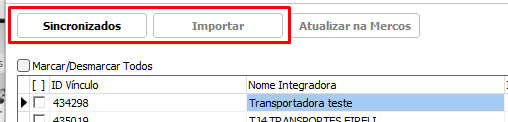 Ao acessar a aba, será apresentado tudo em branco, porém caso você já tenha algum transportador cadastrado no Mercos no qual queira cadastrar ou vincular no sistema, será necessário pressionar a opção Importar. Ao clicar na opção importar, os transportadores no site do mercos serão importartados para o sistema, podendo então ser visivel através da aba Sincronizados.