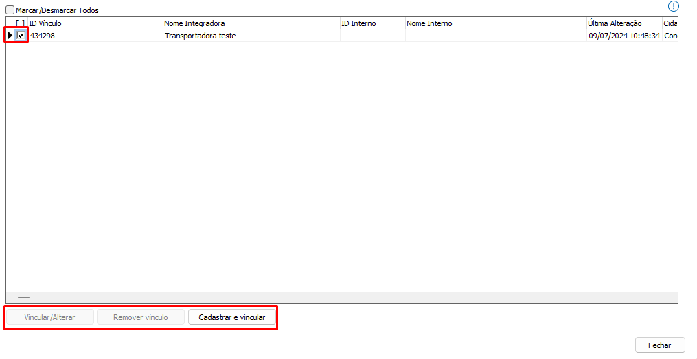Após isso caso queira Cadastrar ou Vincular o transportador localizado, selecione o mesmo e será apresentado as opções a baixo.