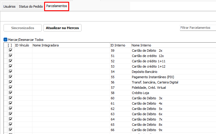 Neste campo será para vincular ou enviar parcelamentos cadastrados para o Mercos.
