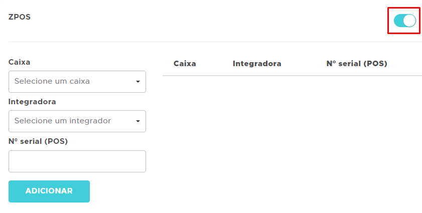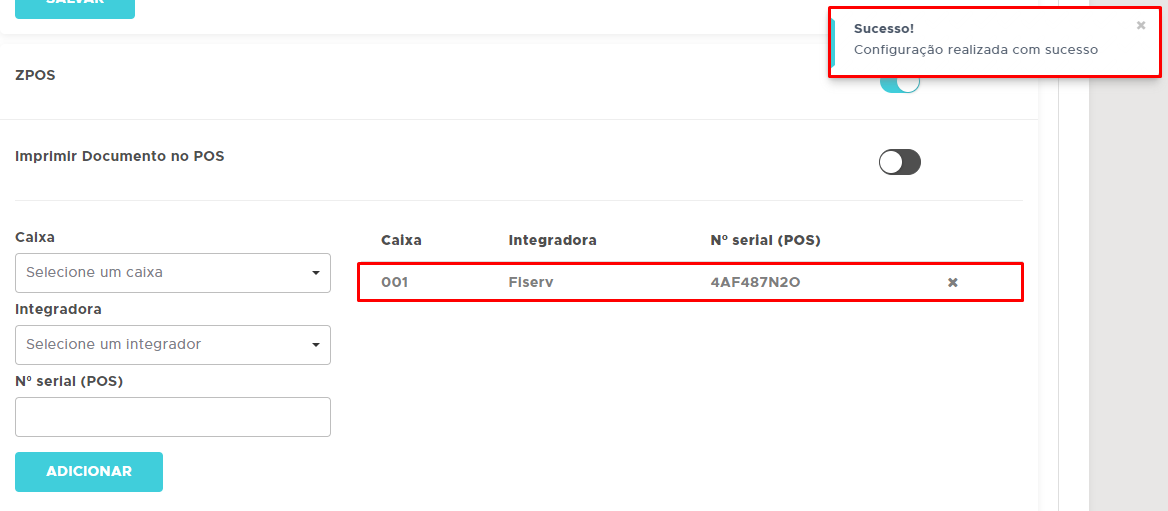 Primeiro será necessário informar o caixa no qual ficará a maquininha, no campo Integradora selecione a opção Fiserv e por fim informar o Número do Serial da maquininha no campo Nº Serial (POS). Após isso basta clicar em Adicionar.