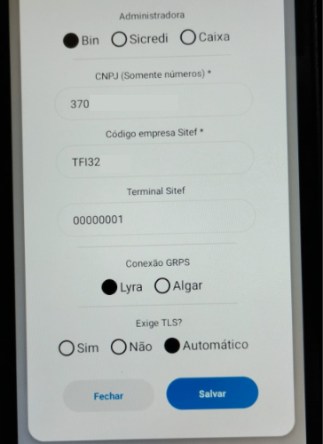 Após isso deverá ser informado a Administradora, CNPJ da empresa proprietária, Código da empresa (que recebeu do banco ou Fiserv), Terminal (padrão são 7zeros +1) - Conexão GPRS Lyra (chip fiserv) ou Algar (chip vivo) - Exige TLS (padrão deixar automático)