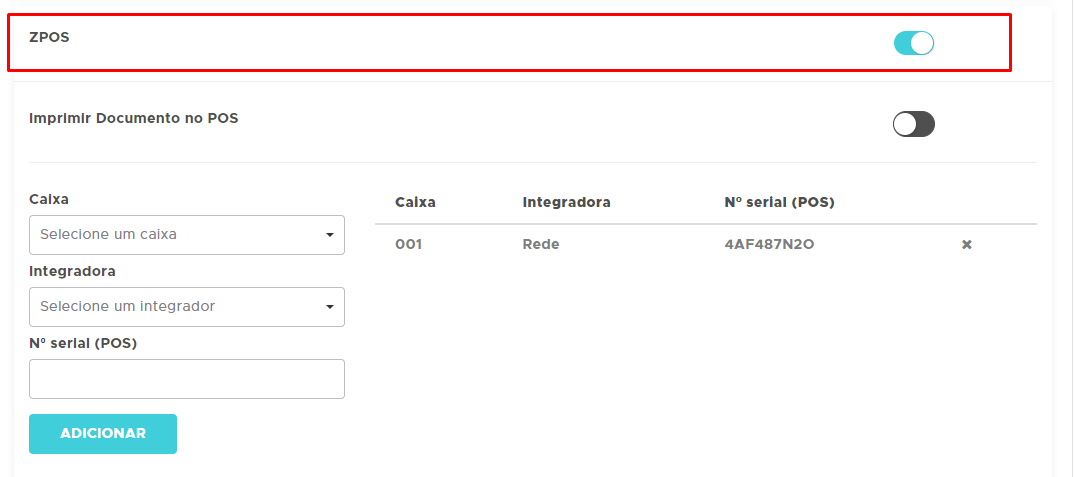 Preencha as informações colocando o número do caixa, selecione a integradora Rede, coloque o número de serial da maquininha, pode ser encontrado atrás da maquininha ou acessando o app ZPOS;