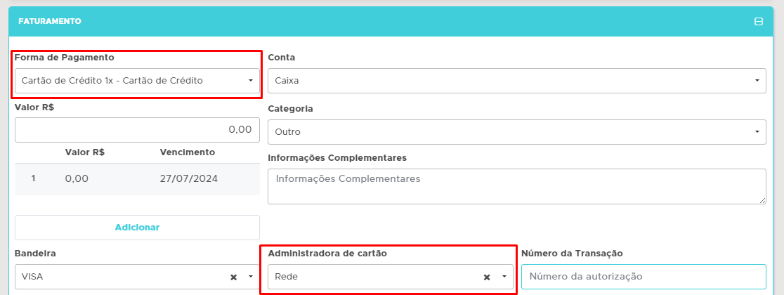 Depois de realizar as configurações, vá até o módulo para fazer a venda, NFCe/PDV/Gerencial, monte a nota, coloque uma forma de pagamento que seja cartão, seleciona a Administradora de Cartão Rede e clique em Adicionar;