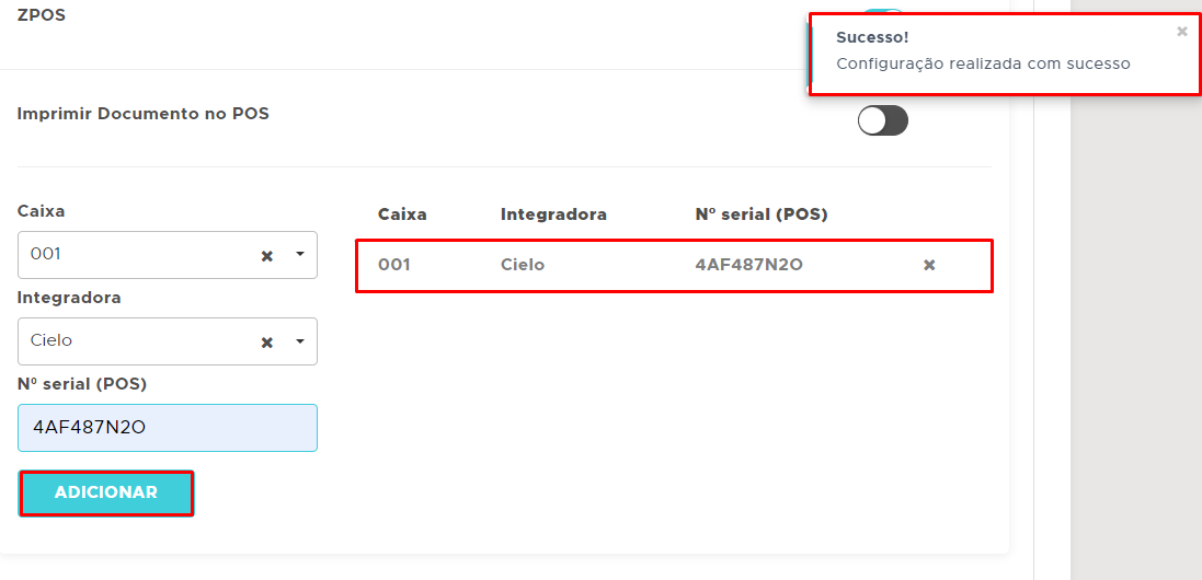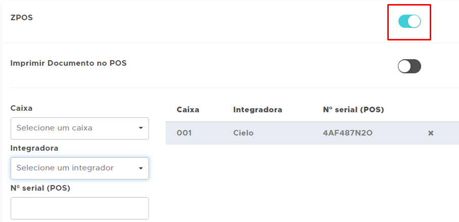 Preencha as informações colocando o número do caixa, selecione a integradora Cielo, coloque o número de serial da maquininha, pode ser encontrado atrás da maquininha ou acessando o app ZPOS;
