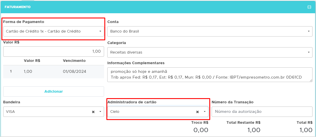 Depois de realizar as configurações, vá até o módulo para fazer a venda, NFCe/PDV/Gerencial, monte a nota, coloque uma forma de pagamento que seja cartão, seleciona a Administradora de Cartão Cielo e clique em Adicionar;