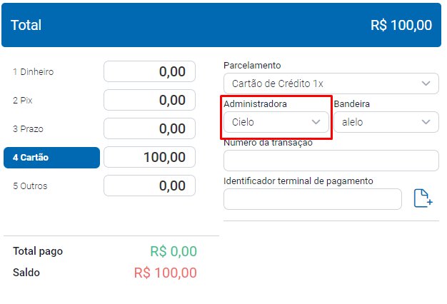 Ao fazer a nota, no campo de Forma de Pagamento, terá de selecionar a forma de pagamento como Cartão, informar o Parcelamento e a Administradora.