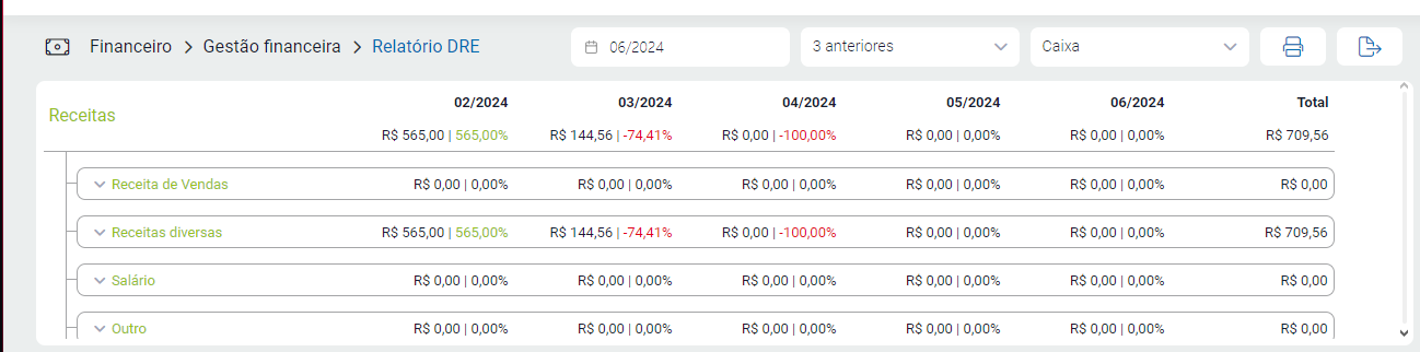 Deixando estas opções marcadas o relatório do DRE será apresentado separando através do plano de contas.