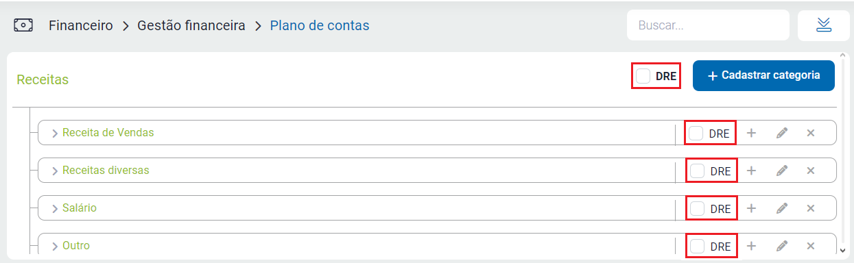Com isso será apresentado os planos de contas cadastrados no sistema, no qual terá a opção de marcar para gerar no DRE.
