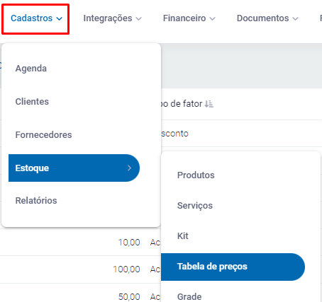 Primeiramente acesse Cadastros - Estoque - Tabela de preços.