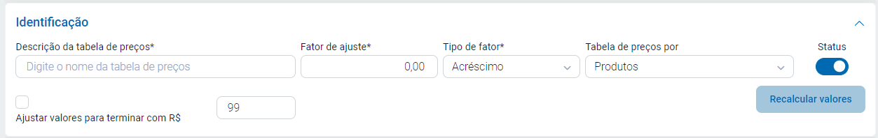 Ao abrir será apresentado os campos para preenchimento da tabela de preço.