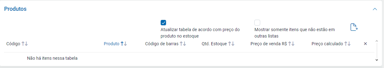 Para os produtos será apresentado uma caixa de opções em baixo, neste local será vinculado os produtos a tabela de preço.