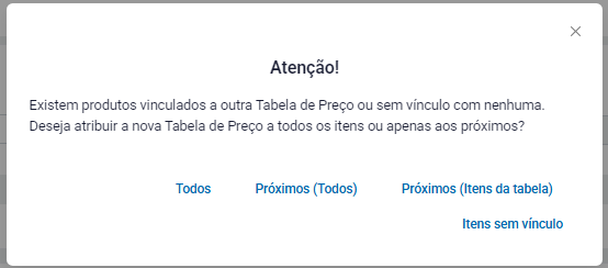 Após isso selecione a tabela e confirme. Será apresentado se quer utilizar a tabela para todos os itens ou somente para os próximos.