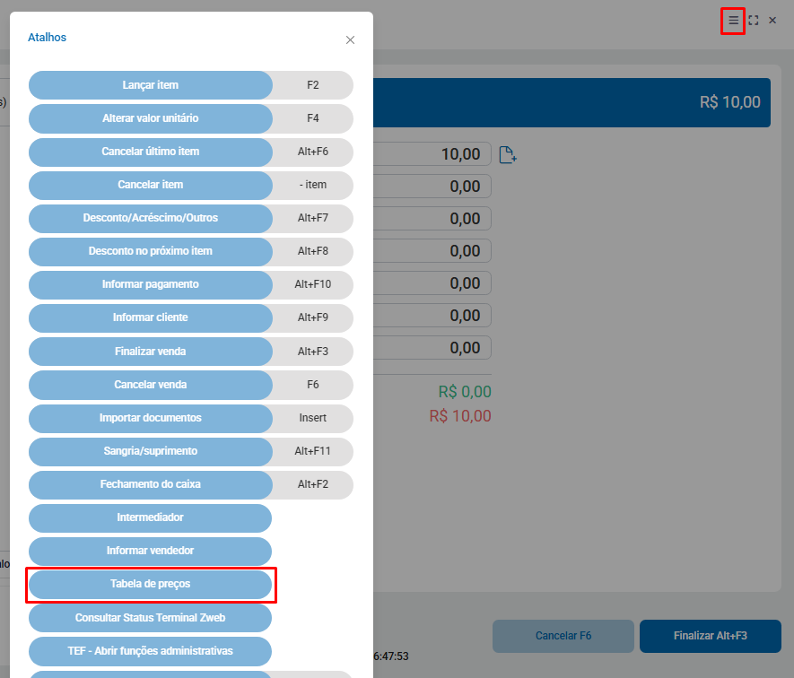 O mesmo ocorre no PDV, acesse o icone " ☰ " e após isso em tabela de preço.