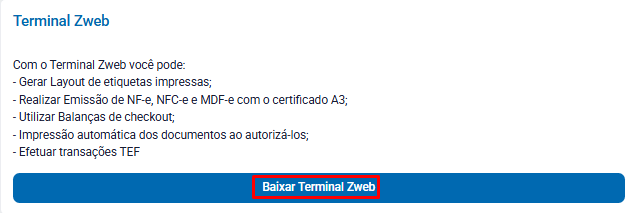 Após acessar os dados da empresa, localize a aba Integrador / Terminal ZWEB e clique sobre Baixar Terminal ZWeb.