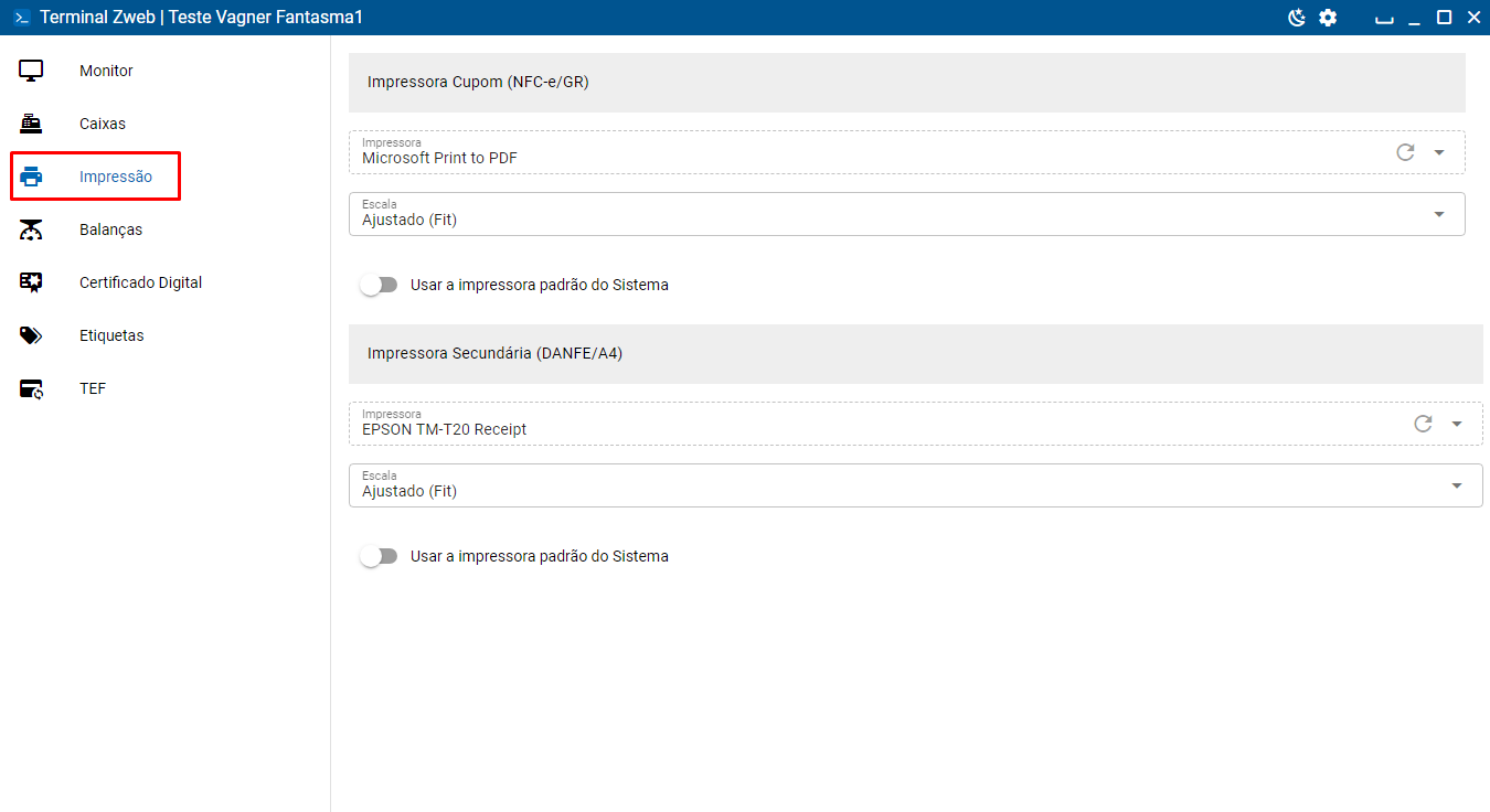 Caso a sua impressora esteja como padrão do Windows, pode estar selecionando a opção Usar a impressora Padrão do Sistema.
