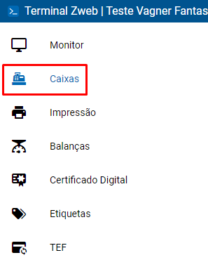 Primeiro processo vai ser vincular o terminal ao Caixa utilizado no Zweb, está etapa é de extrema importância para os outros módulos de configuração do terminal funcionarem corretamente, portanto acesse Caixas.
