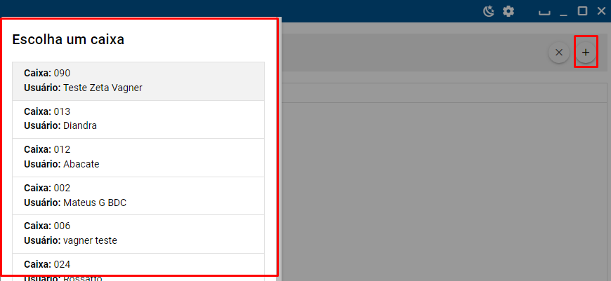 Após acessar a aba de caixas, poderá vincular os caixas pressionando o botão "+" disponível no canto superior direito da tela, será apresentado então os caixas disponiveis para vincular a estas configurações.