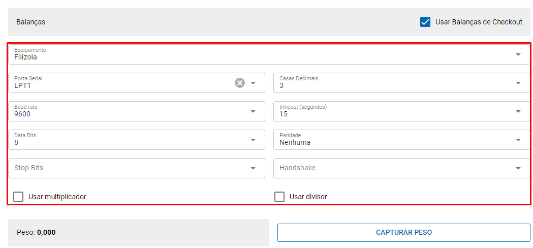 Ao efetuar o preenchimento, clique em Capturar Peso para efetuar um teste de comunicação com a balança, caso ocorrer normalmente, será apresentado o peso ao lado esquerdo.