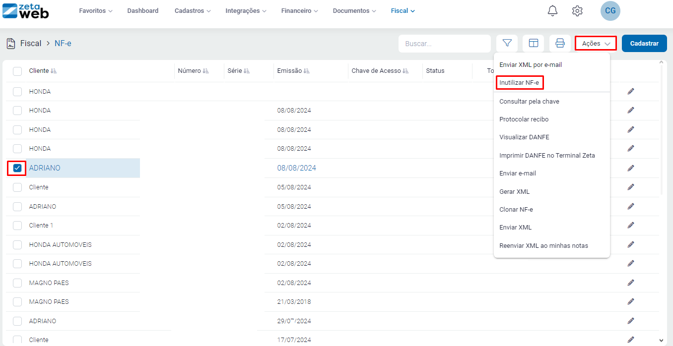 Em seguida, selecione a nota que você precisa, vá em Ações - Inutilizar NF-e