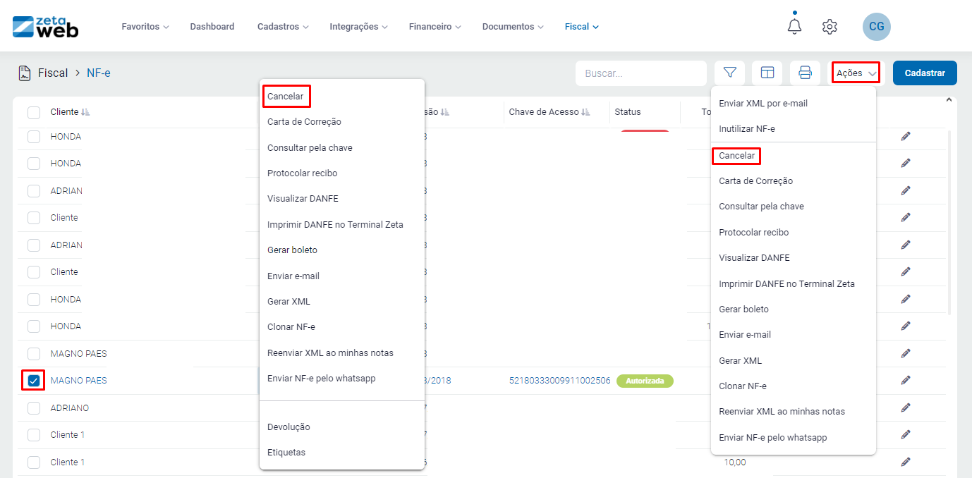 Selecione a nota Autorizada que irá ser cancelada, pressione com o botão direto - Cancelar ou vá no menu Ações - Cancelar.