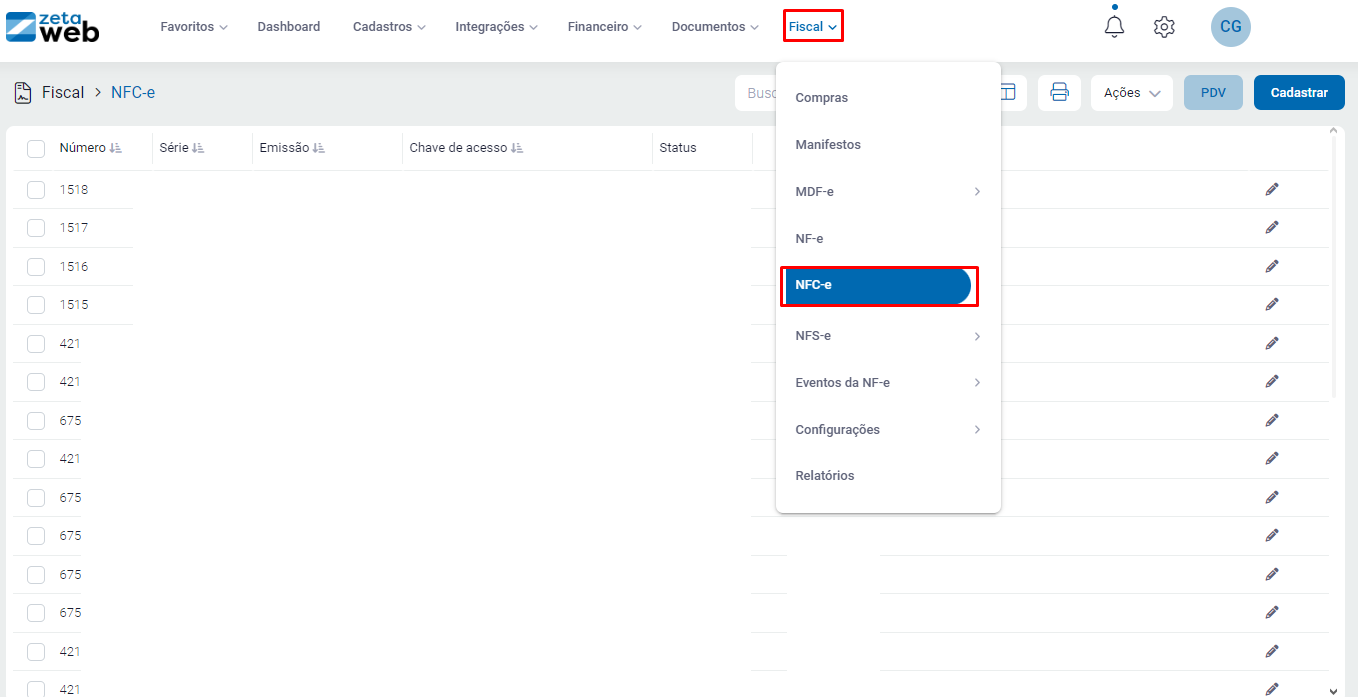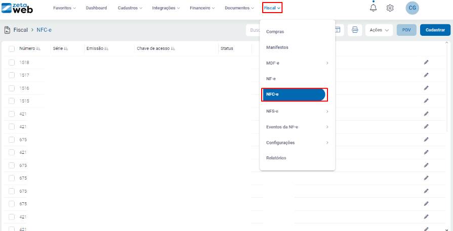 Em seguida, acesse o menu Fiscal - NFC-e.