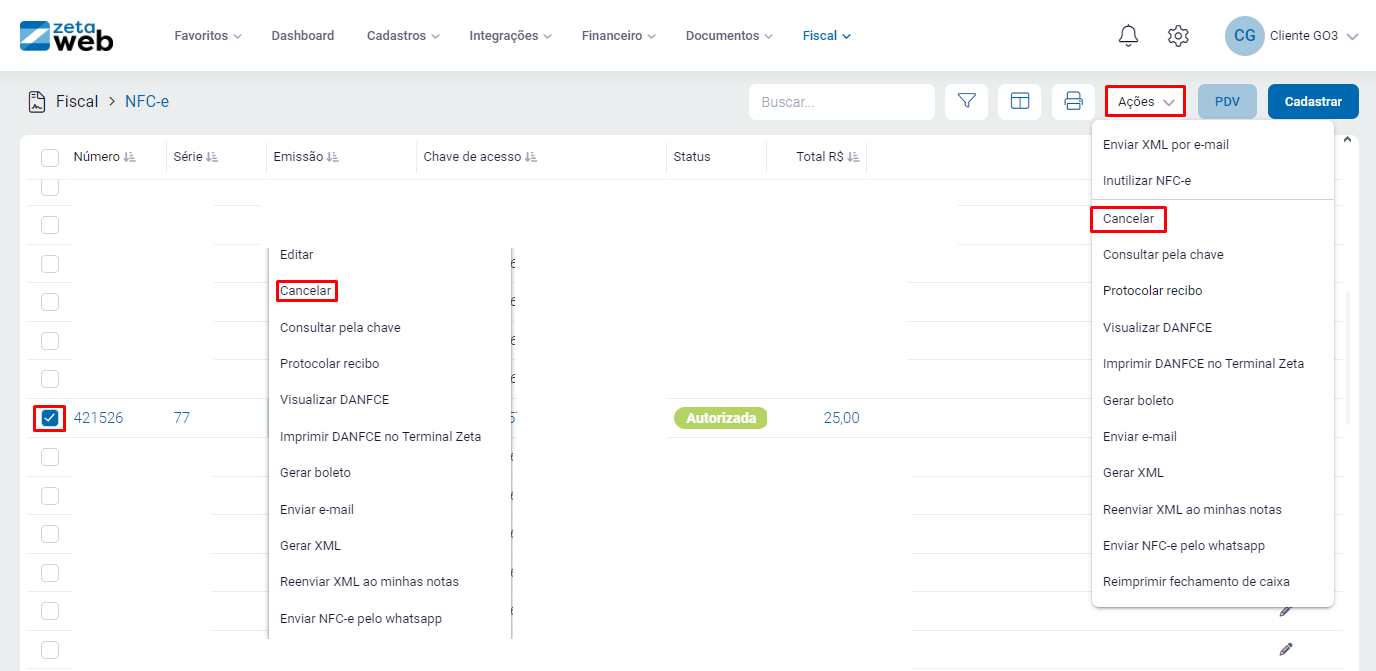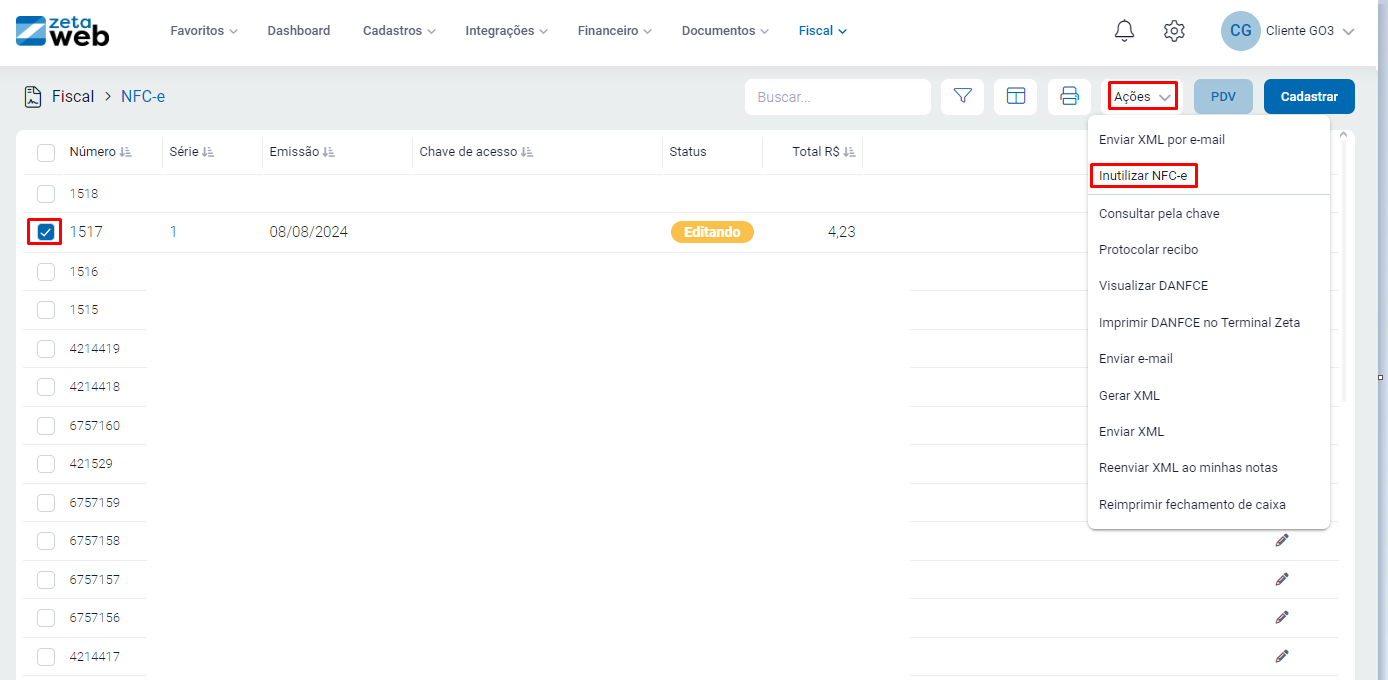 Em seguida, selecione a nota que você deseja inutilizar, vá no menu Ações - Inutilizar NFC-e.