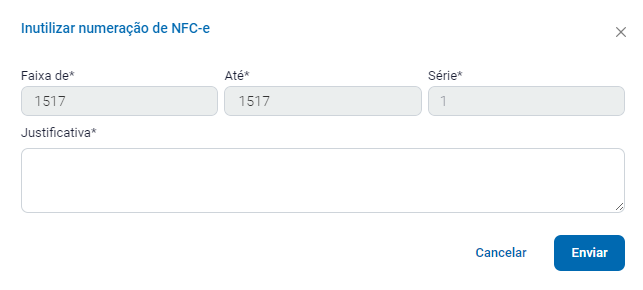 Ao pressionar Inutilizar NFC-e, uma aba de Inutilização aparecerá, é necessário colocar uma Justificativa de no mínimo 15 caractéres.