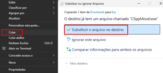 Após isso clique com o direito na pasta EXE, e clique em Colar, ou utilize o atalho CTRL+V, será necessário substituir o arquivo que já está na pasta.