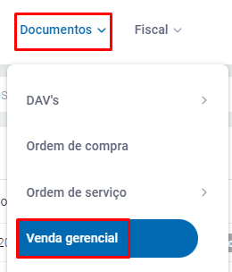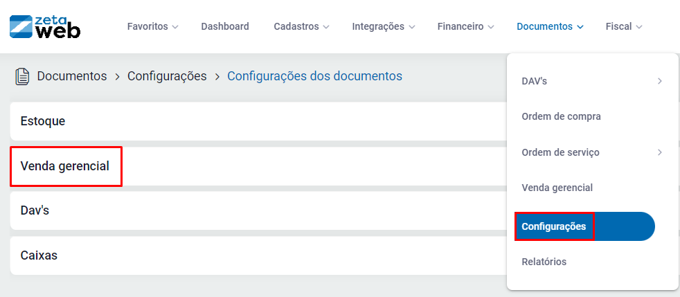 Também será necessário efetuar a configuração referente ao venda gerencial, acesse Documentos > Configurações > Venda Gerencial
