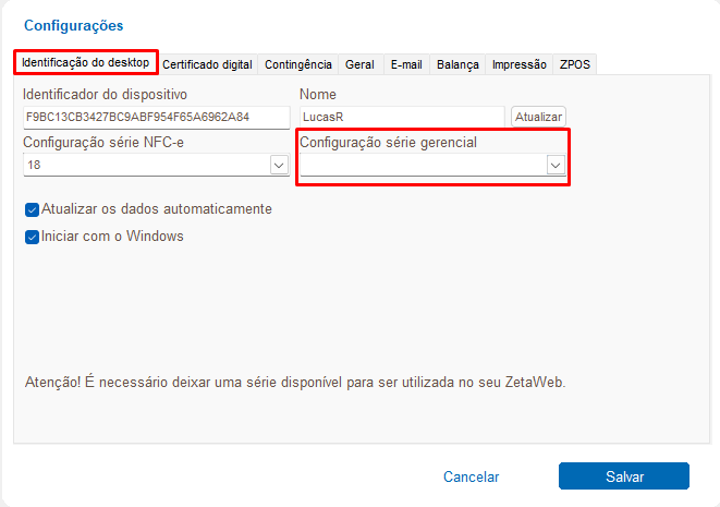 Na aba Identificação do Desktop selecione a configuração no campo Configuração série gerencial.