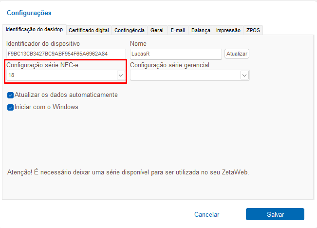 Para utilizar o Gerencial também é necessário selecionar Configuração Série NFC-e, caso não tenha nenhum modelo para selecionar, siga o passo a passo para configurar clicando aqui.