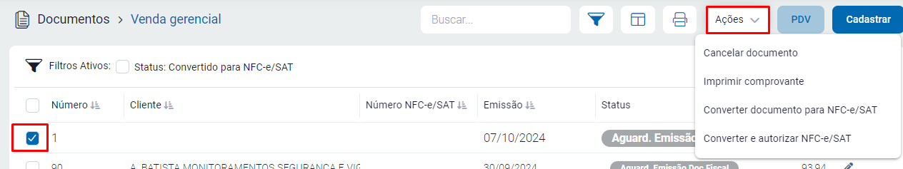 Assim que localizar o cupom emitido, selecione o mesmo e cliquem em Ações.