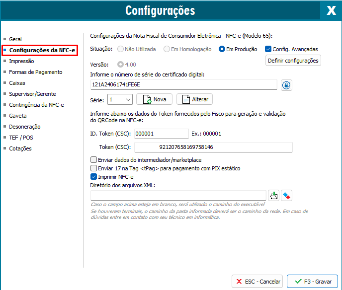 Acesse o módulo do emissor de NFC-e e após isso precisone F10 para abrir as Configurações e acesse Configurações da NFC-e.