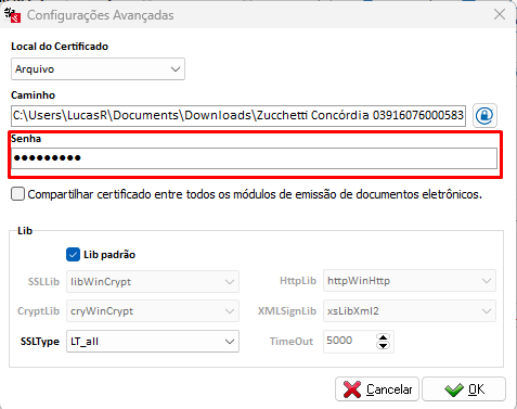 Preencha a senha do certificado.