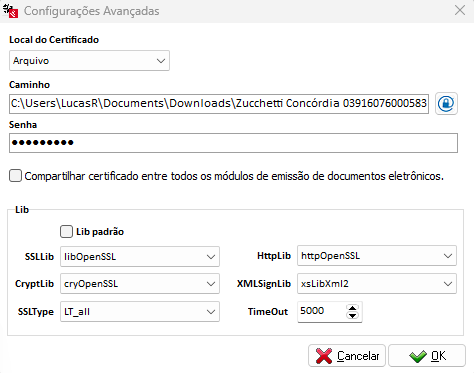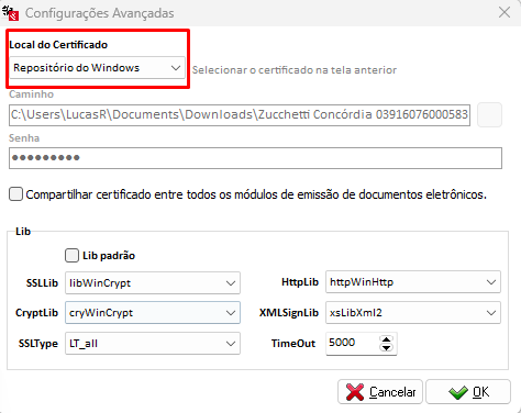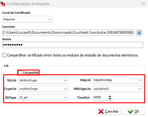 Após selecionar o certificado desta forma, desmarque a opção Lib Padrão e selecione libOpenSSL nos campos SSLib, CryptLib e httpWinHttp.