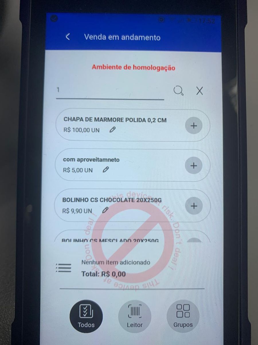 Para localizar o produto há 3 formas diferentes, podendo ser pela pesquisa padrão através do nome do produto, pode estar efetuando também a leitura do código de barras, utilizando o leitor da própria maquininha, para isso utilize a opção Leitor ou até mesmo localizar através dos grupos cadastrados no sistema.