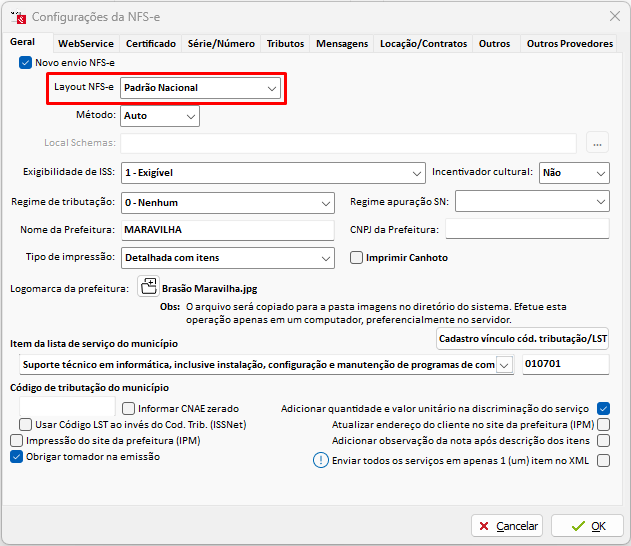 Nas configurações, a opção Novo envio NFS-e deve estar marcada, será apresentado o Layout NFS-e, neste campo será informado o Padrão Nacional.
