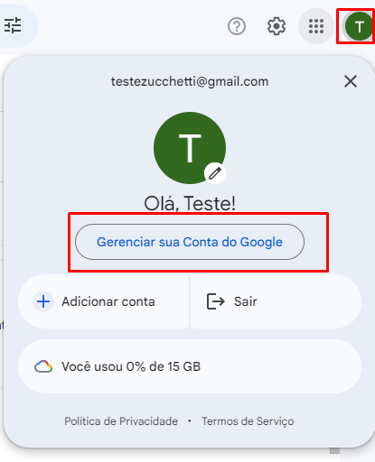 1. Após acessar sua conta, acesse no canto superior direito o seu perfil e cliquei na opção Gerenciar sua conta Google.