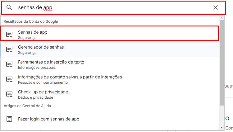 3. Depois de ativar a verificação em duas etapas, vá até a barra de pesquisa no gerenciamento da conta e pesquise por Senhas de App;
