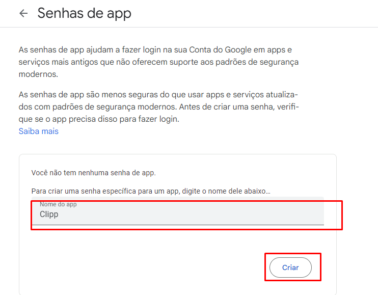 Após clicar em Senhas de app o Google vai solicitar a senha da conta novamente, depois de colocar a senha será apresentada uma janela chamada Senhas de App, um pouco abaixo é possível visualizar um campo solicitando o nome do APP, preencha como ''Clipp'' e clique no botão criar.