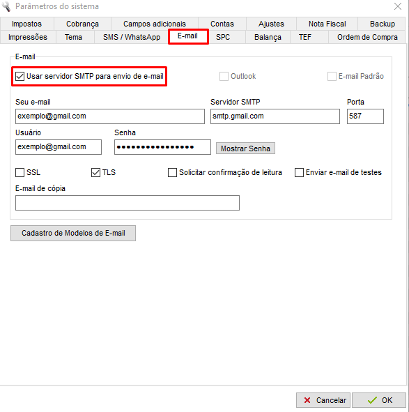 1. Abra o ClippStore e vá até - Configurações > Parâmetros > E-mail e marque a opção de Usar Servidor SMTP para envio de e-mails;