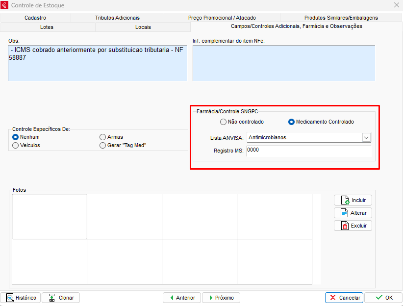Acessando o cadastro de seus produtos, será apresentado um novo campo na aba de Campos/Controles adicionais, Farmácia e Observações, referente ao controle SNGPC.