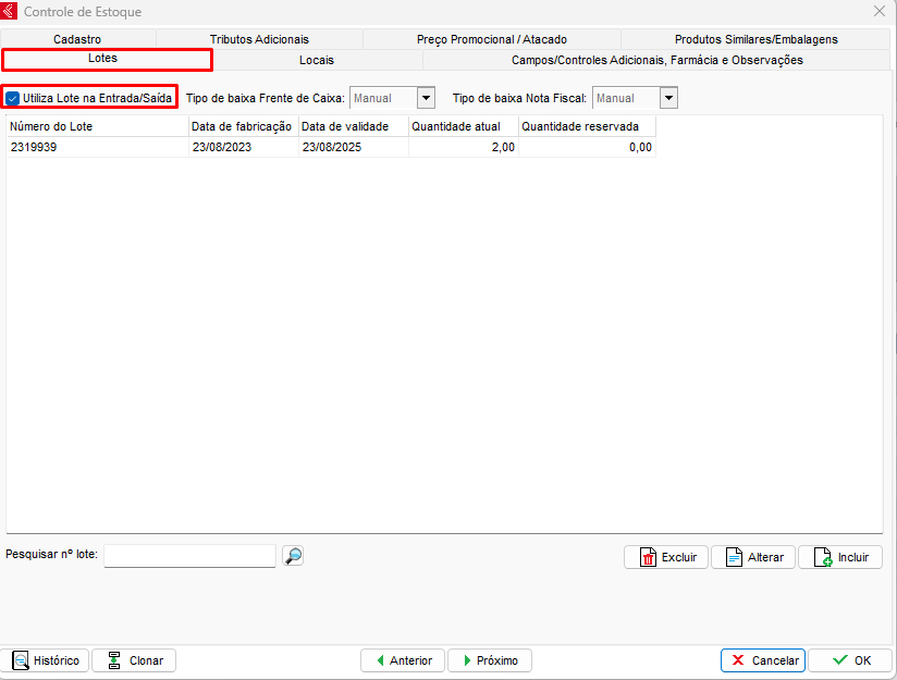 Por ser um produto controlado, será necessário utilizar o registro de lotes, acessando a aba Lotes marque a opção Utiliza Lote na Entrada/Saída.